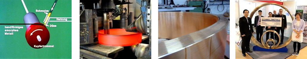 非晶金属,与传统合金不同,没有晶体结构,组织像玻璃成无序化,因此又称为金属玻璃。生产过程中,将熔化物浇注在HOVADUR®铜套上,之后迅速冷却成带材。此工艺对铜套要求极高,HOVADUR® 导热性能可以满足此需求。此技术也可用于钎焊带材及纳米晶带材的生产。